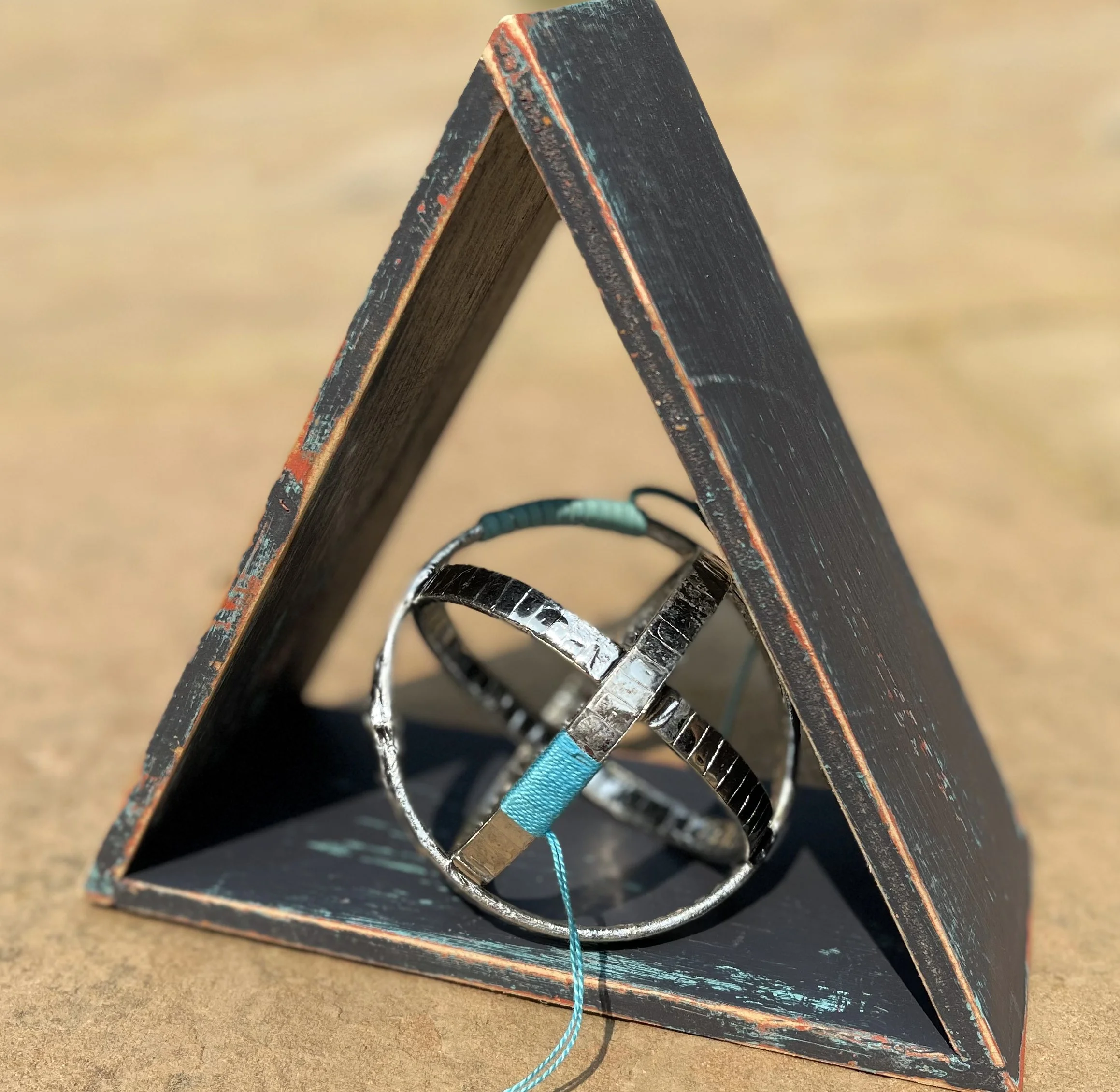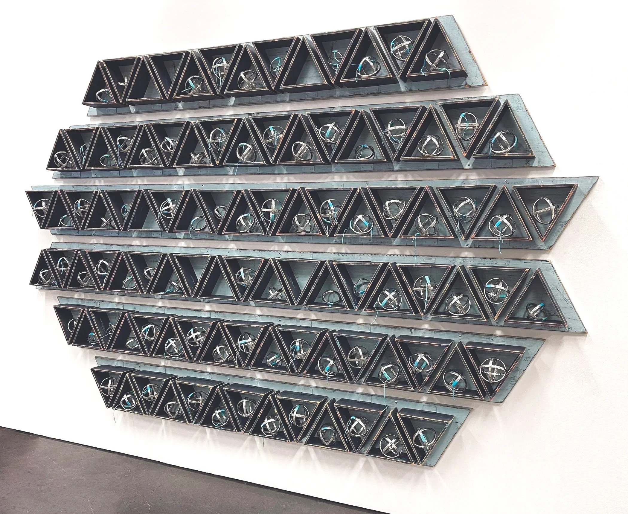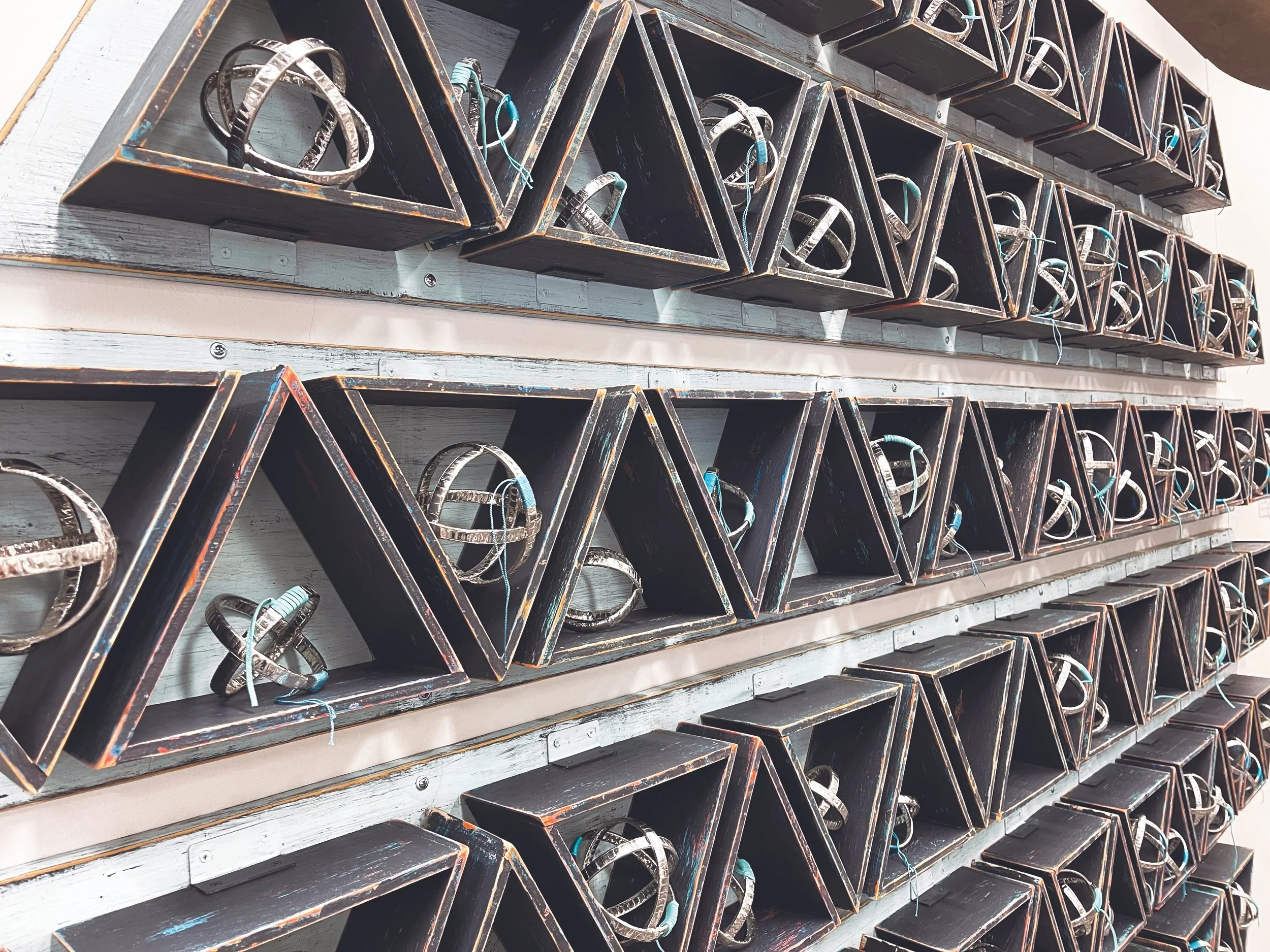 In Anne’s sculpture, all work hours are unpaid. Larger silver spheres represent a full hour of unpaid labor and smaller spheres represent half an hour of unpaid labor. Spaces in the matrix represent waking hours when Anne was not working.