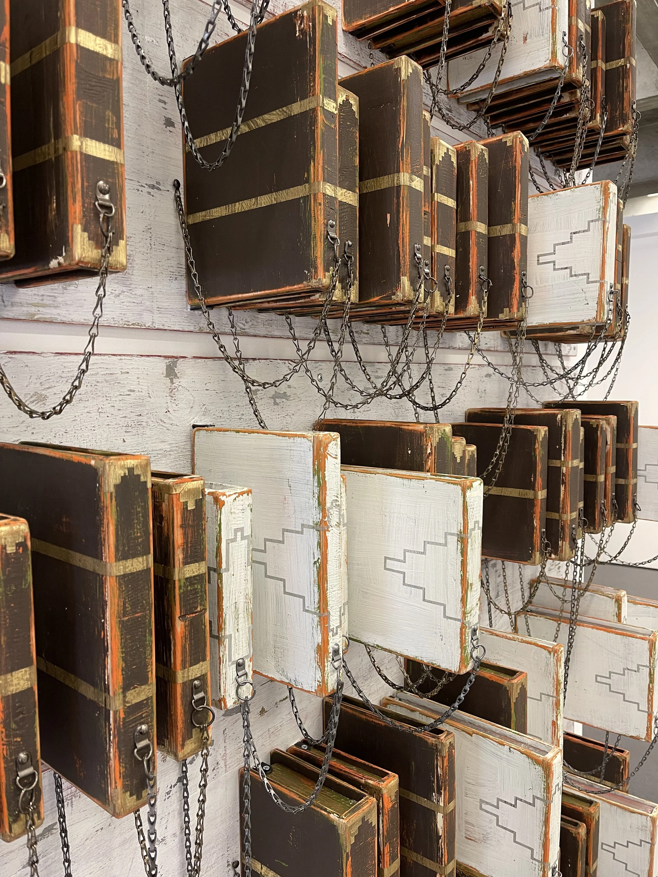Lauren’s paid labor hours are brown and gold “books” and her unpaid labor hours are white and silver “books,” lined up shelf after shelf. The spaces on the shelves represent the waking hours when Lauren was not working. As a nod to the many roles Lauren plays, the paid labor elements are standard academic book sizes, while the unpaid labor elements are standard children’s book sizes.