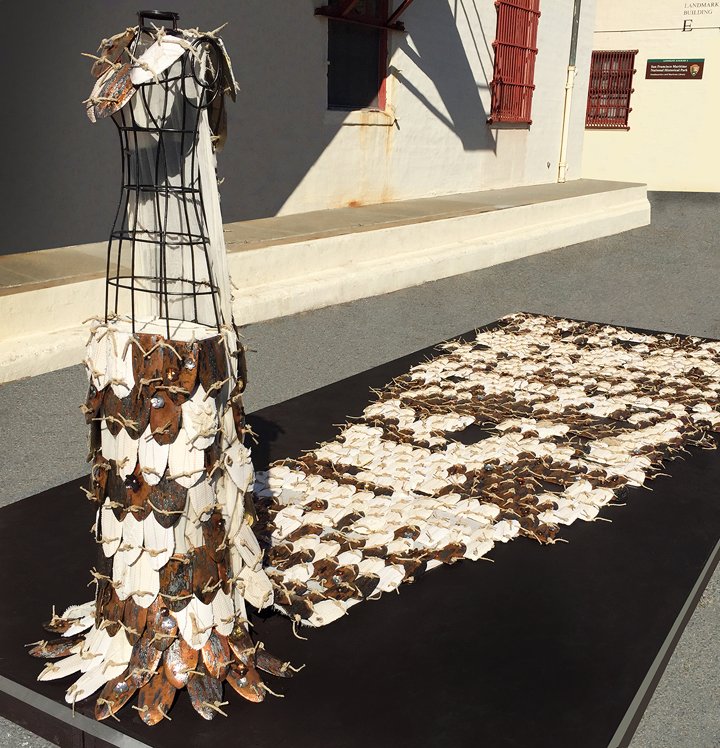 Work data, burnt wood, cotton rope, gold and silver leaf
