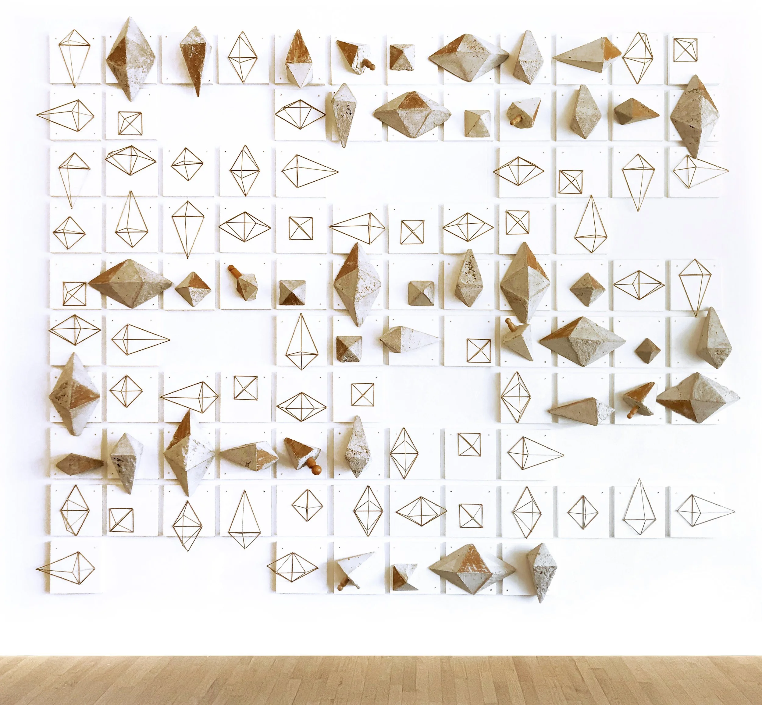 Tracy’s paid labor hours are represented in her sculpture by weighty, mortar forms—grounded and measured, though not perfect. Her unpaid labor hours are also structured, geometric shapes, but the wireframes are less visible, less substantial, as women’s labor is often accorded less status socially. Spaces in the grid indicate the waking hours when she was not working.